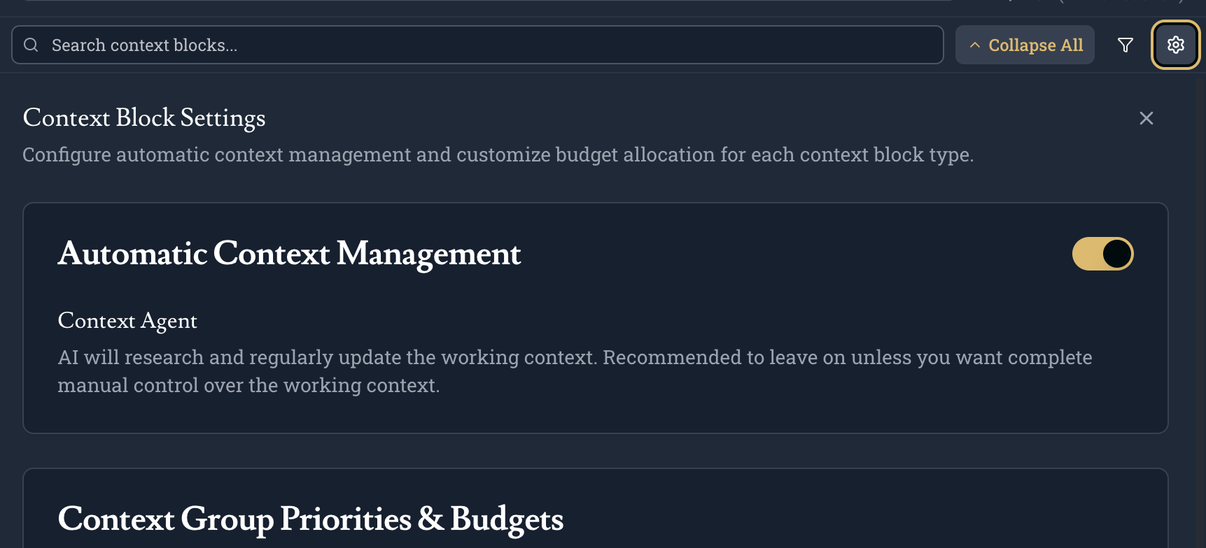 You can manage the priority and limits of your context block groups. If you care more about one type of block over another, you can set its soft budget to be higher than another group in the settings tab.