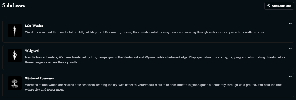 Subclasses let you specialize a class into different playstyles—tankier versions, stealth experts, support casters, and more. Each subclass sits under a base class and adds its own flavor through spells and features.