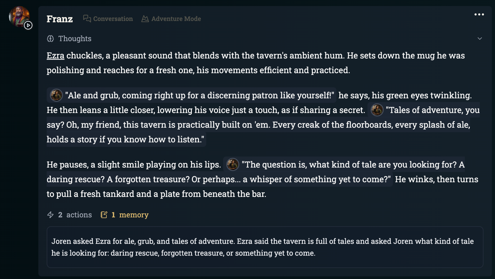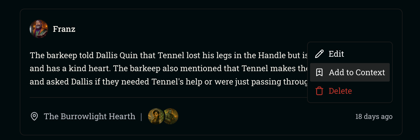 Memories are an important aspect of Friends & Fables to maintain long term campaign coherence. ACE will create memories every 5 turns which encode important information that recently happened such as key characters and plot details in a compressed format. These memories can be searched for and brought into Working Context when deemed appropriate, and combined with the Current Plot form the historical information used by the AI.