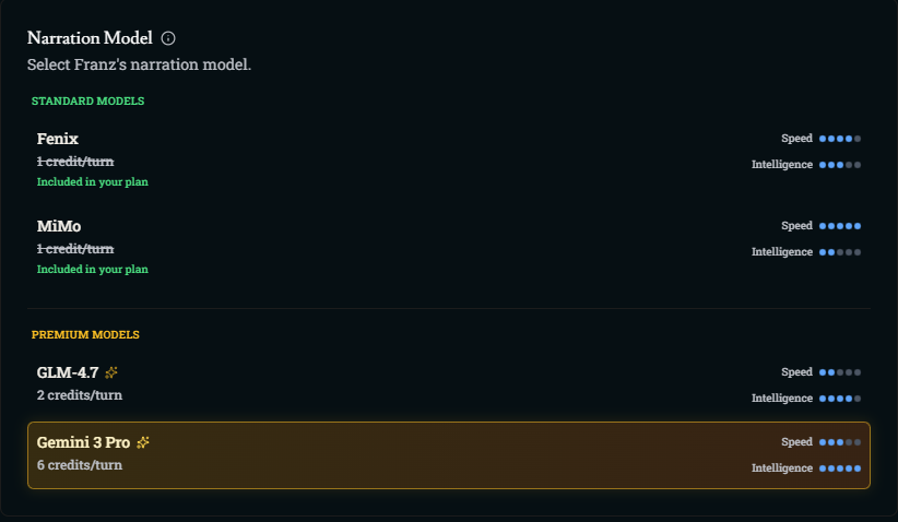 Friends & Fables lets you choose which narration model Franz uses for campaign responses. Different models trade off speed, cost, and output quality