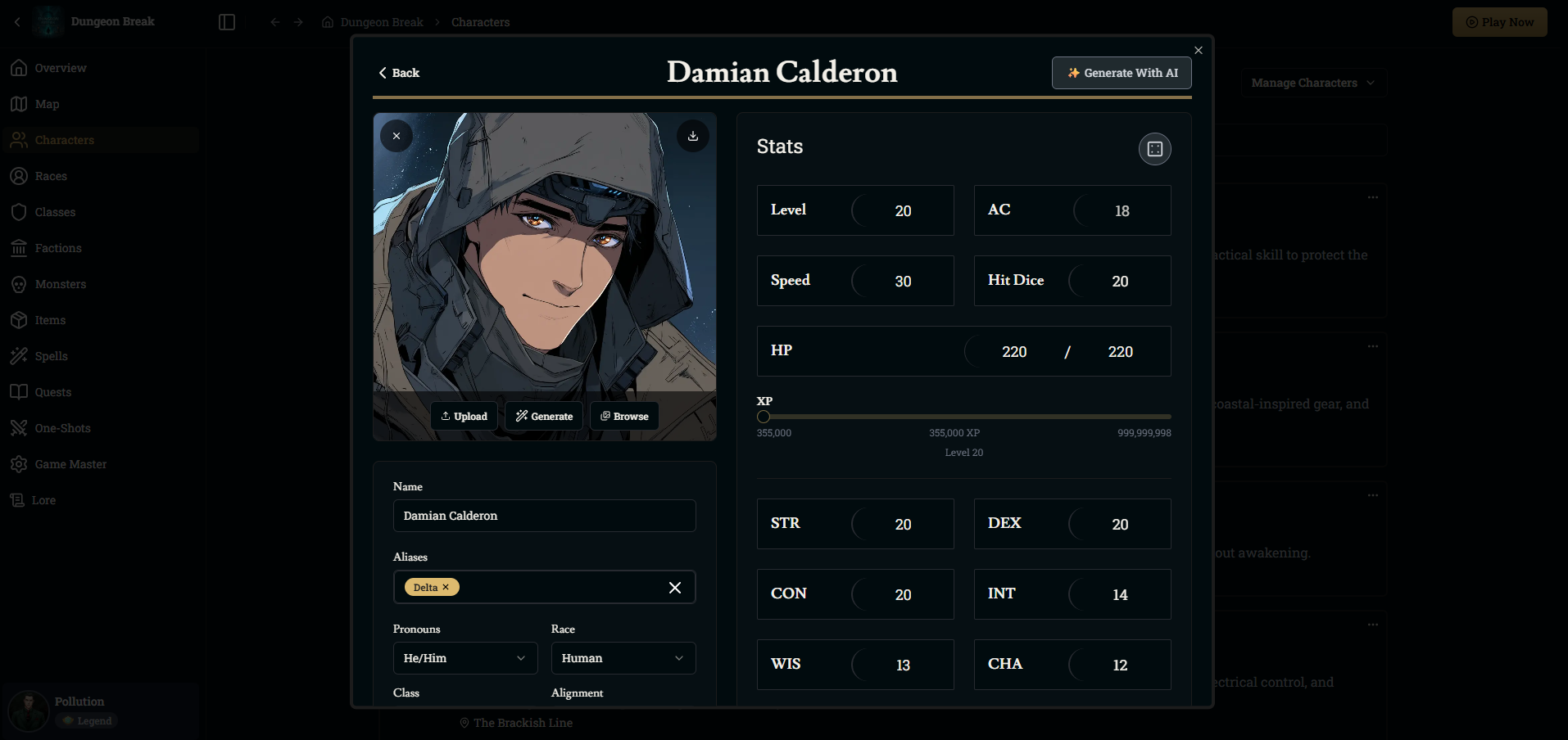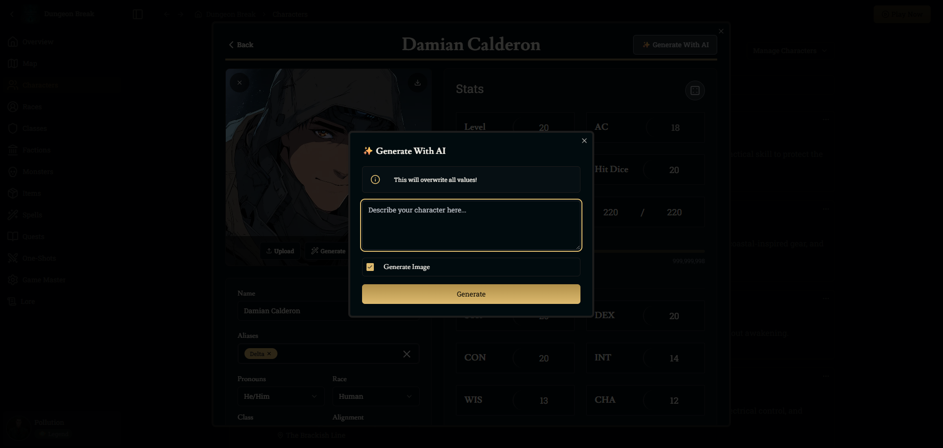 AI generation is flexible, so write as much or as little detail as you want. Franz will fill in the rest with an organized, fully playable character sheet that you can edit afterward. If you have a specific level of play you’d like to start at, be sure to specify that when writing the instructions for generating your character.