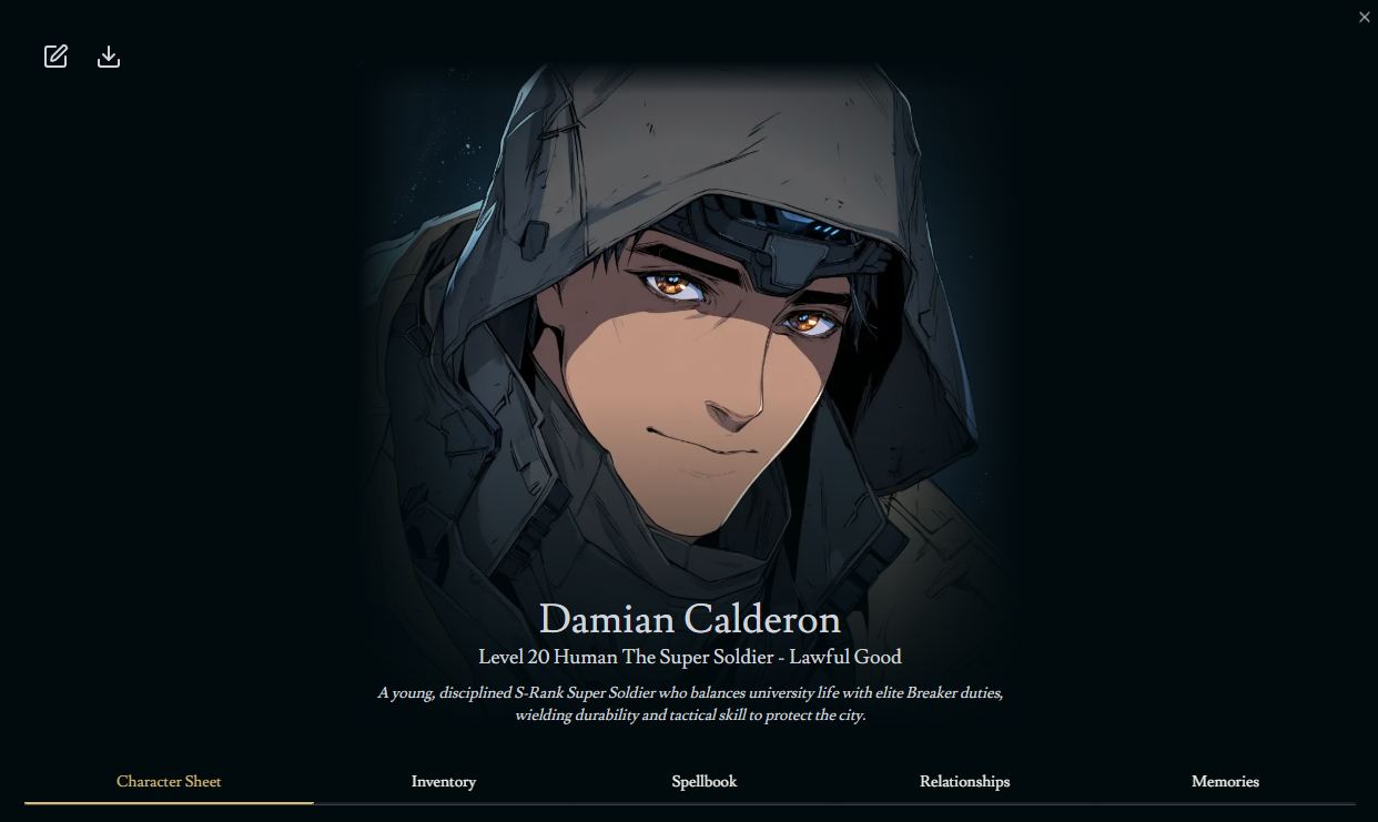 Characters are the heart of your campaigns. Whether you prefer to hand-craft every detail or let the AI handle the heavy lifting, the character creator gives you full control. From appearance and stats to spells, gear, and memories, everything you set here becomes part of your world and is automatically available to Franz during play. You can start simple and refine later, or build something fully realized right from the beginning.
