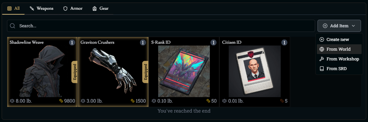 Your character’s inventory is fully editable at any time. From the Inventory tab, you can add items from the World, your Workshop, or the SRD. You can also create completely new items on the spot. Equipment such as armor, weapons, and gear can be equipped directly by selecting the item and clicking Equip. Equipping automatically updates relevant stats on the sheet. Some items increase your armor class, stats, or speed.