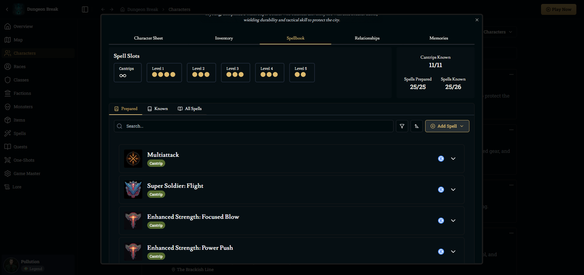 Your spellbook holds every spell and ability your character can learn or prepare. You can search for spells, add custom spells, or import spells to the world. Each entry can be expanded to show descriptions, rolls, and casting details.