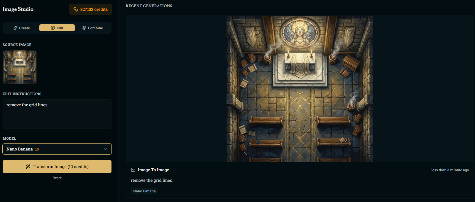 Edit Mode is perfect for fixing maps, polishing character art, removing watermarks, or updating old images.