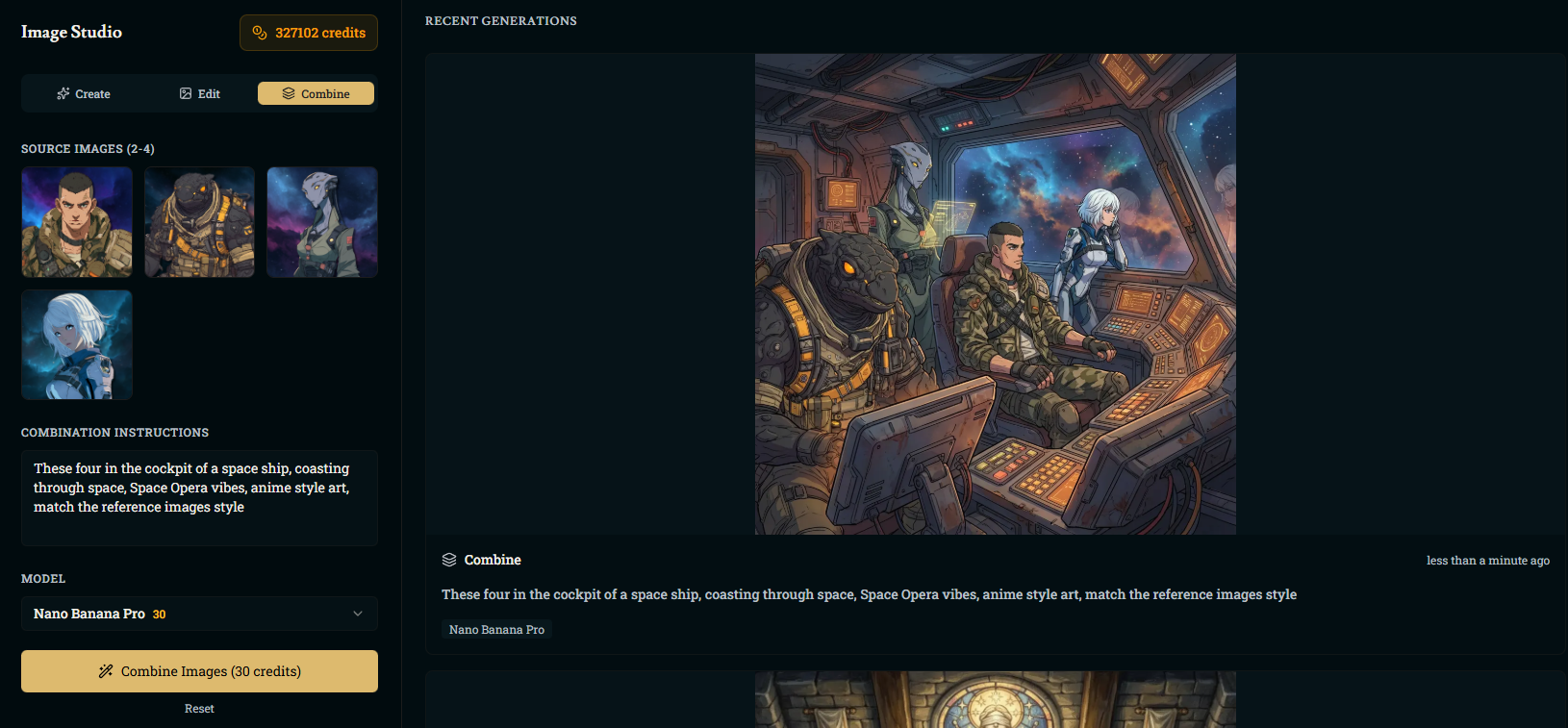 Combining costs the same amount as editing, but certain models cost additional credits per image included in the combination. Be sure to check the final credit cost before confirming whenever you go to combine images!