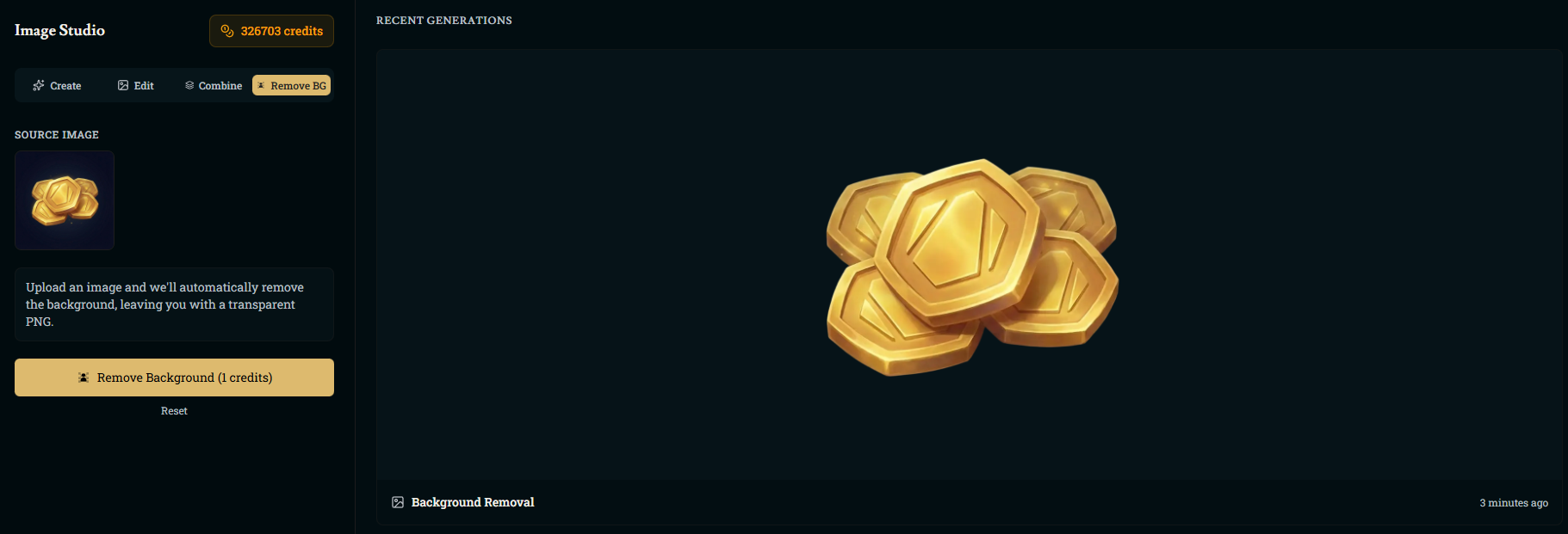 The Image Studio is your all-in-one hub for creating, editing, and combining artwork for your games. You can access it anytime from the main navigation bar by clicking Image Studio on the left side of the screen.